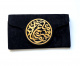 Pochette calligraphy en tissu traditionnel tunisien en soie rembourré et en cuir avec une partie en calligraphie arabe dorée. Dimensions : 30cm x 15cm